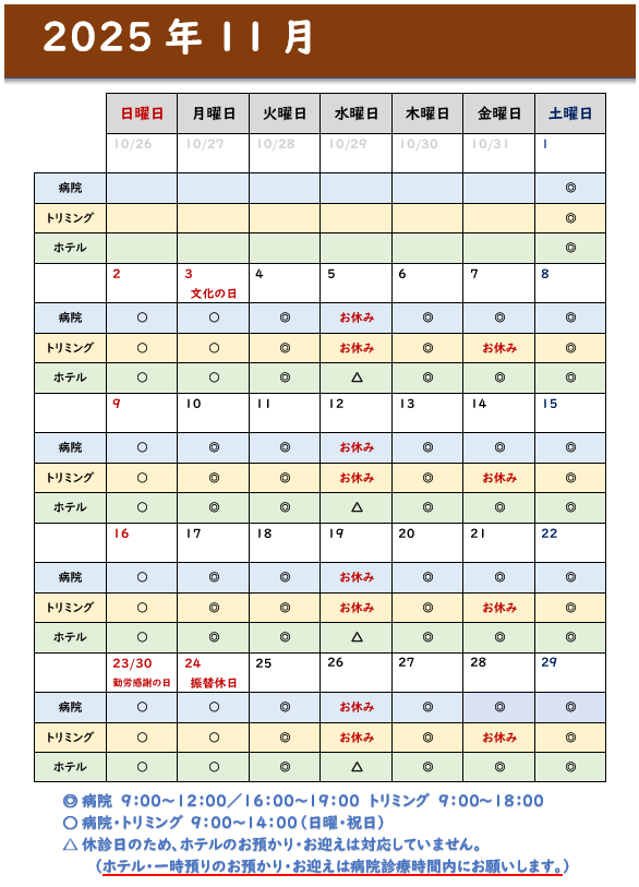 トリミングは休診日の水曜日と毎週金曜日がお休みです。