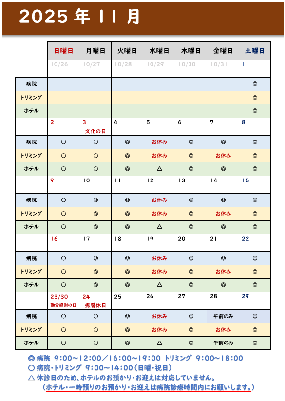 11月の病院のスケジュールです。