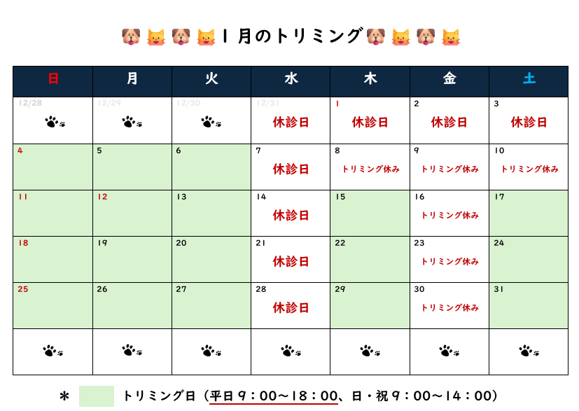 トリミングは休診日の水曜日、毎週金曜日、年末年始の1/1(木)~1/3(土)、1/8(木)、1/10(金)がお休みです。