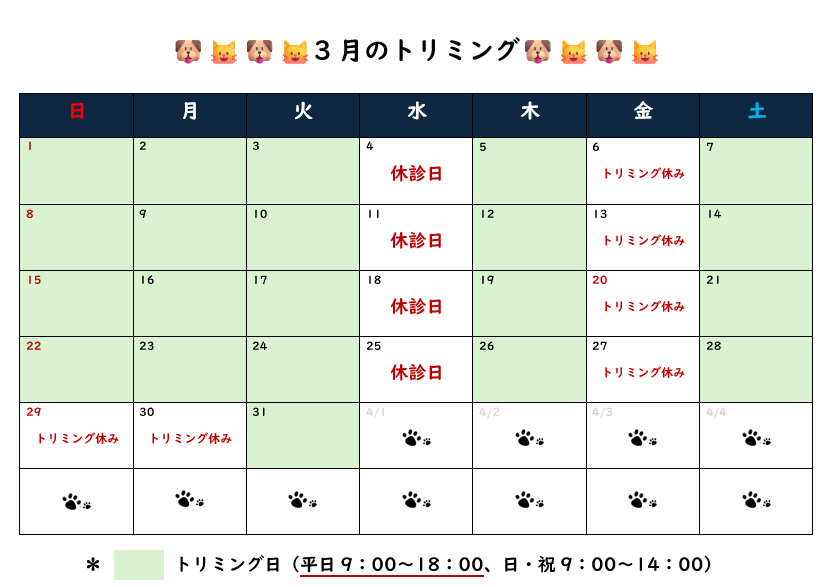 トリミングは休診日の水曜日と毎週金曜日と3/29(日)、3/30(月)がお休みです。